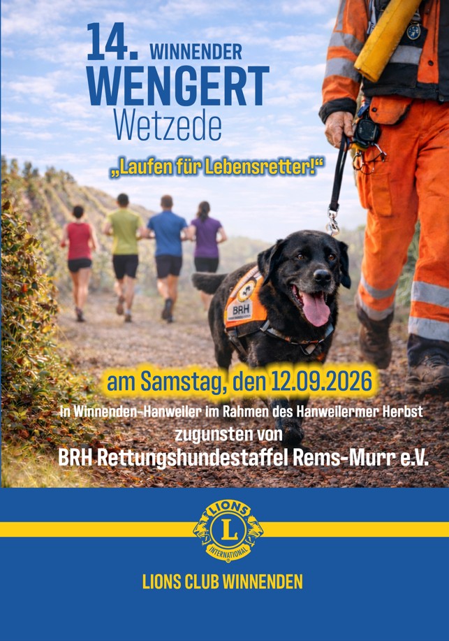"Laufen für Lebensretter!" - zugunsten der BRH Rettungshundestaffel Rems-Murr e.V. Lauft mit bei der 14. Winnender Wengert Wetzede als Einzelläufer oder als Team mit Eurem T-Shirt oder unter Eurem Motto!